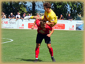 den Querbalken köpfte (14.). In der 18. Minute tauchten Stein und Bernsdorf erneut im Gäste-Strafraum auf. Der Querpaß auf den mitgelaufenen Stein erwies sich nicht als die bessere